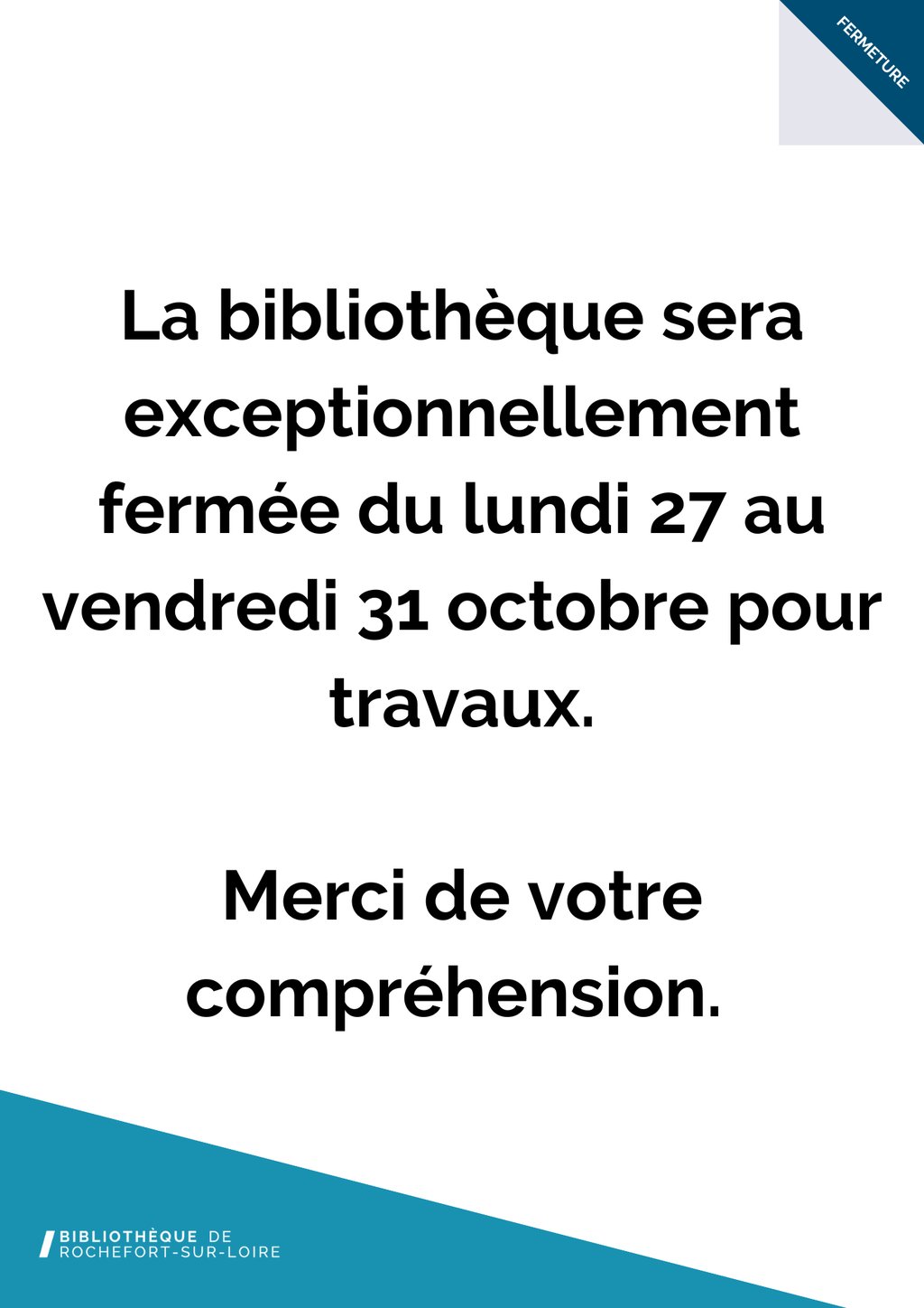 FERMETURE DE LA BIBLIOTHÈQUE POUR TRAVAUX DU 27 OCTOBRE AU 1ER NOVEMBRE