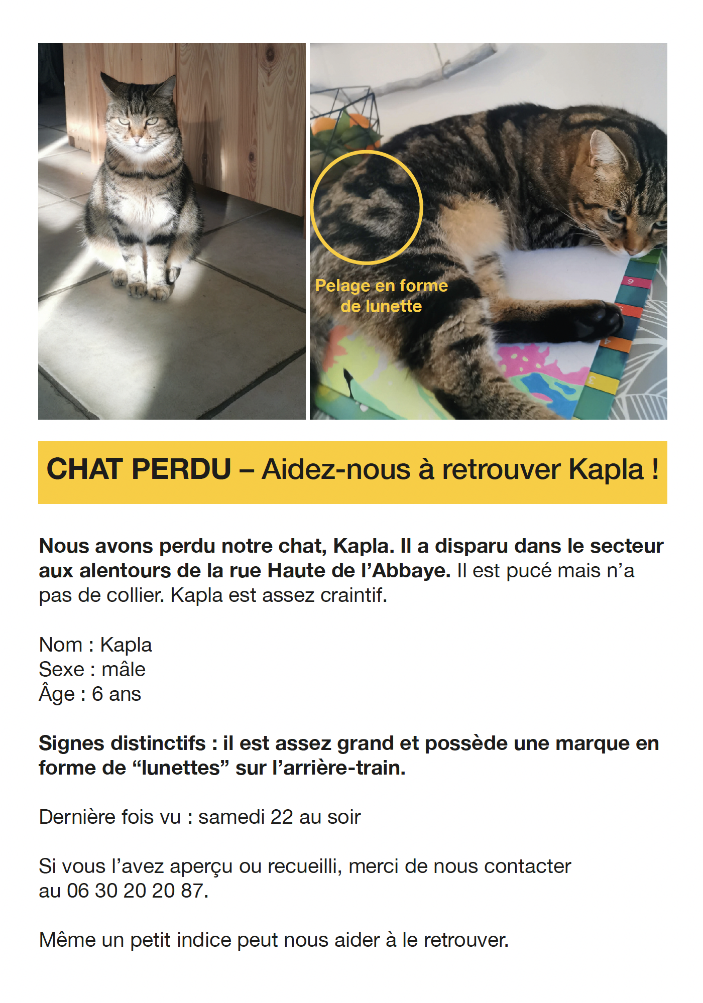 AVIS DE RECHERCHE : CHAT PERDU RUE HAUTE DE L’ABBAYE