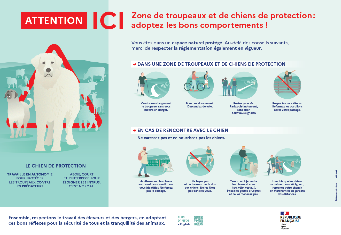 Les champs sont entourés de 4 fils électriques. Les chiens protègent leur troupeau. Ils seront donc attentifs à votre passage.